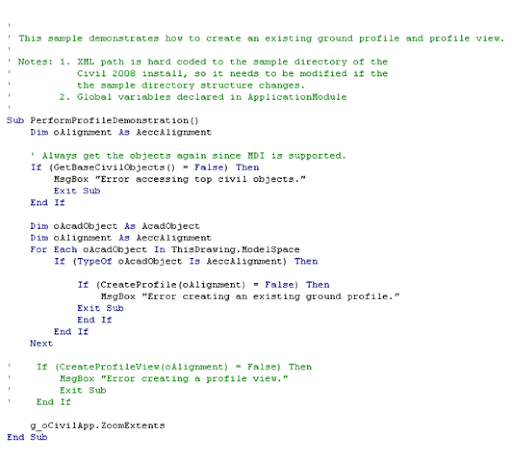 As a starting point I am going to be using a renamed copy of the VBA profile sample: C:\Program Files\AutoCAD Civil 3D 2008\Sample\Civil 3D API\Vba\Profile\ProfileSample.dvb