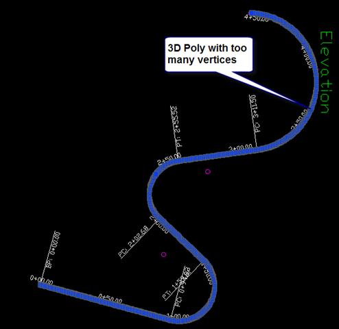 Now turn the 3D polyline into a feature line, go ahead and weed the feature line. You will want to make the lengths long enough to get rid of all of the PI's along the tangents to minimize the number of structures that we won't need. Now fit the curves, if you have any.